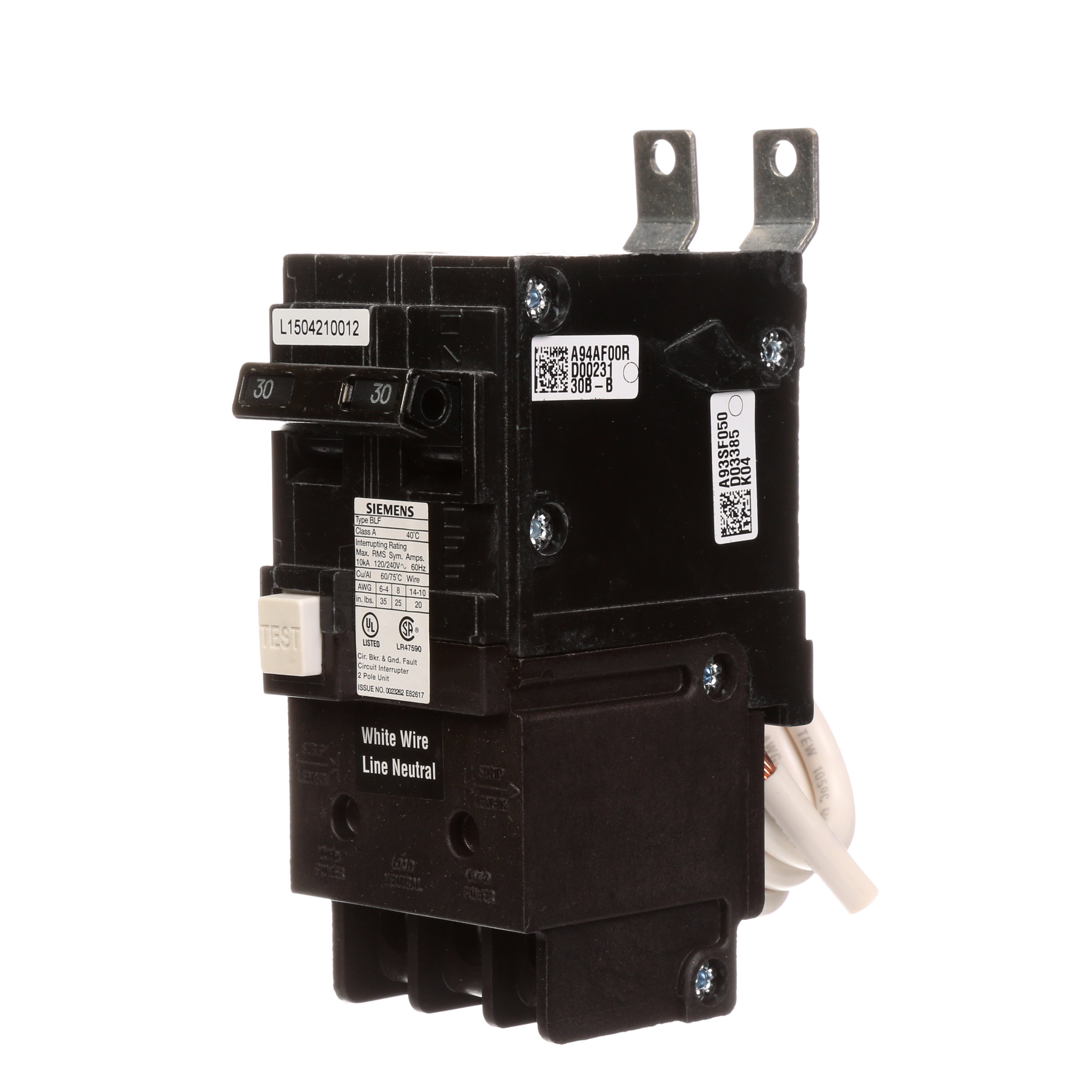 Siemens SpeedFax™ Molded Case Circuit Breaker, Type BLF GFCL, 120/240 VAC, 30 A, 10 kA Interrupt, Thermal Magnetic Trip, 2 Pole, 1 ph, Bolt-On Mounting, 40 deg C, 2 in L x 4 in W x 6 in H Dimensions