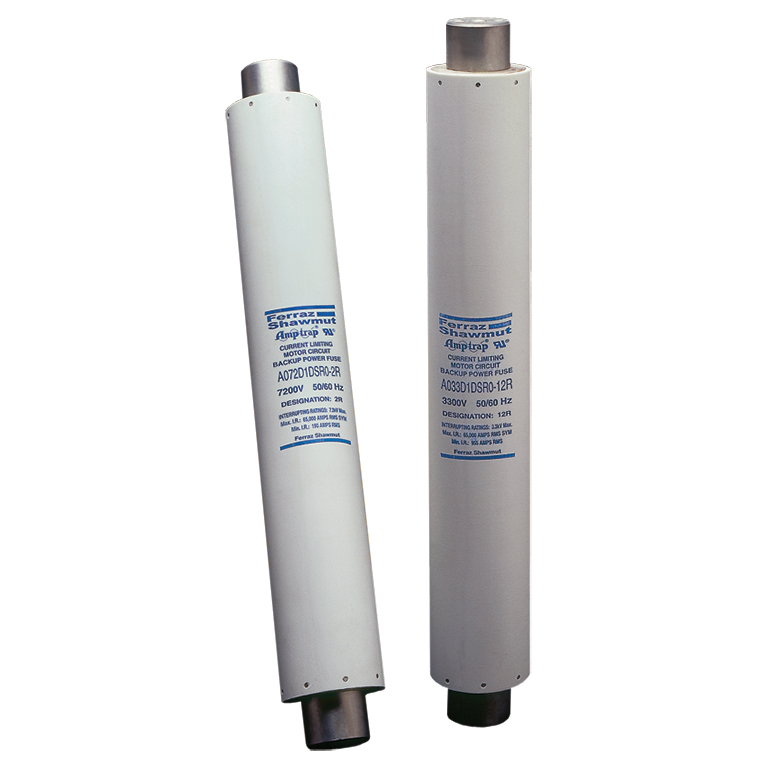 AMP-TRAP® R-rated DIN style fuses are current limiting, high interrupting rating fuses, intended for the short circuit protection of medium voltage motors and motor controllers. This product range offers north American R-rated performance in the IEC 282-1 DIN mounting configuration of 442 mm. R-rated fuses are applied as back up fuses that have a minimum interrupting rating, and must be coordinated with overload relays in combination motor starters. AMP-TRAP® R-Rated, DIN type fuses are offered in voltage ratings of 3.3 kV, 5.3 kV and 7.2 kV in ratings from 2R to 19R. All fuses within this product group are UL component recognized.