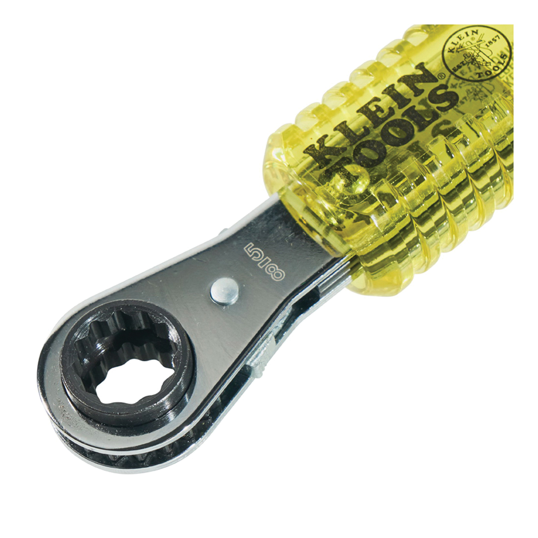 Klein® Lineman's Box Wrench, 4-in-1 Combination Insulated Ratcheting, Measurement System: SAE, 1/2 to 3/4 in Wrench Opening, 12 Points, 9 in Overall Length, Textured Groove Handle, Polished Chrome