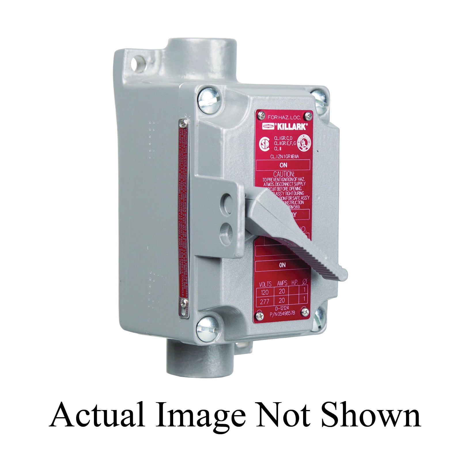 Killark® Tumbler Switch Complete Unit, 1-Phase Feed-Thru, Series: XS Series, 120/277 VAC, 30 A, 50/60 Hz, 1 hp at 120 VAC, 2 hp at 240 VAC, 2 Poles, Rotary, Front Lever, NEMA 7C/7D/9E/9F/9G Enclosure, Aluminum, Gray, 5-7/8 in H x 3 in W x 4-1/16 in D