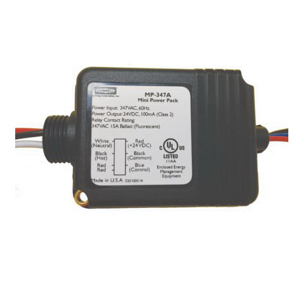 The MP347A is a self-contained transformer and relay (an ON/OFF switch controlled by a circuit) designed for low voltage 24 VDC occupancy sensors. This power pack is capable of switching 15 A loads and feature zero arc point switching, minimizing relay contact wear from high inrush loads. A single power pack can power either 3/2 sensors and the MPSA auxiliary relay for multiple circuits. The power packs are plenum rated and easily mount inside or outside of a junction box or inside a fluorescent ballast cavity.