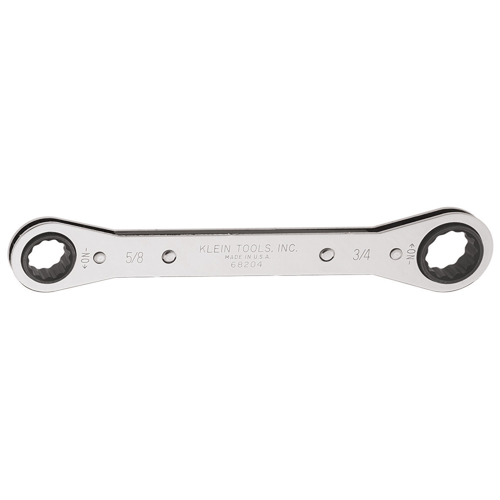 Klein® Box Wrench, Standard, Measurement System: SAE, Offset/Ratcheting/Reversible/Spline Wrench, 5/8 x 3/4 in Wrench Opening, 12 Points, 8-1/4 in Overall Length, 25 deg Offset, 25 deg Head, No Tether Capable, Steel, Polished Chrome