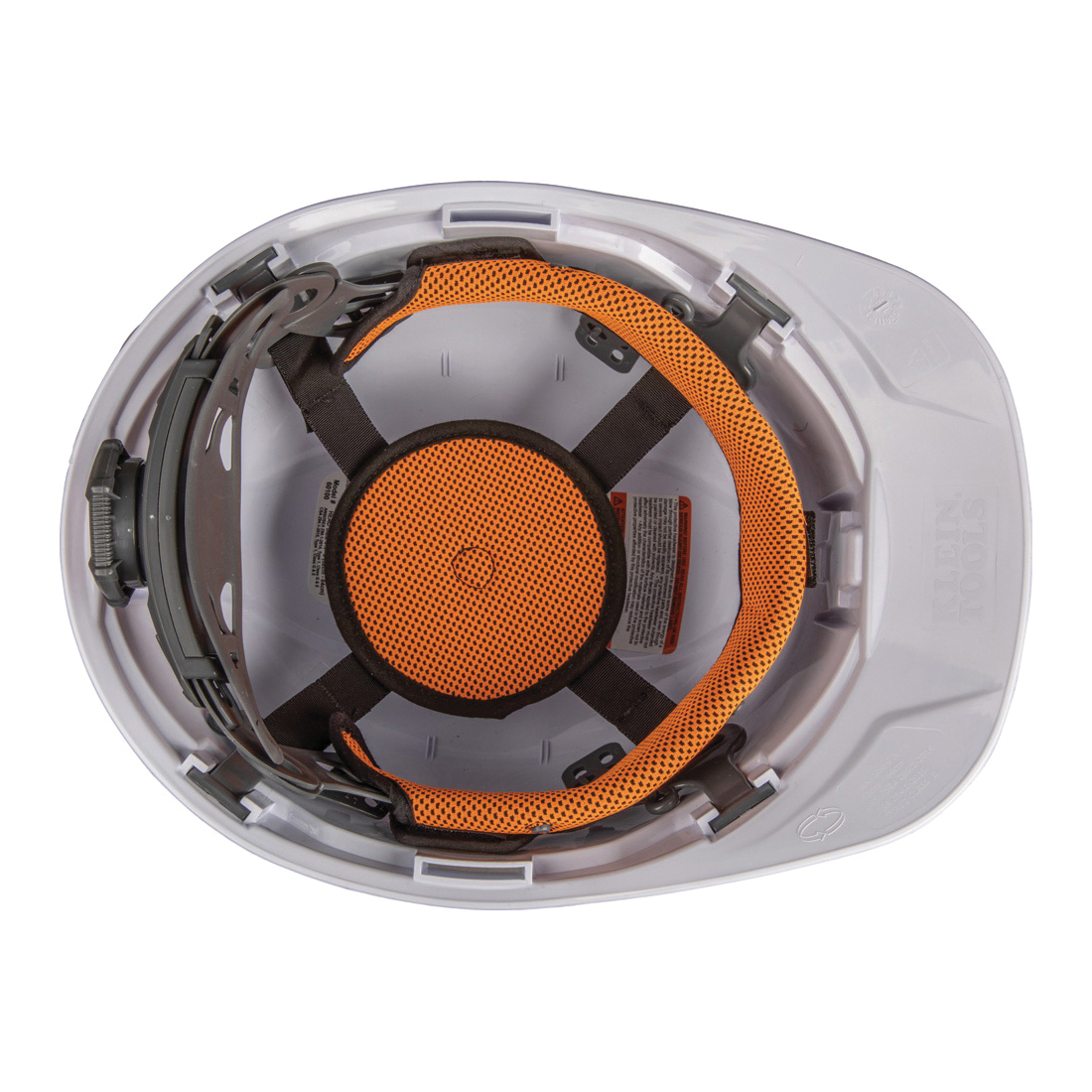 Klein® Hard Hat, Type 1 Cap Style Non-Vented, 11.5 in L x 8.8 in W x 6.5 in H, Fits Minimum Hat Size: 6-1/2 in, Fits Maximum Hat Size: 8 in, White, ABS/Polycarbonate, 4-Point Reverse Donning Suspension, ANSI Electrical Class Rating: Class E, ANSI Impact Rating: ANSI Z89.1-2014, Slotted: Front/Back/Both Side, Ratchet with Pivot Adjustment