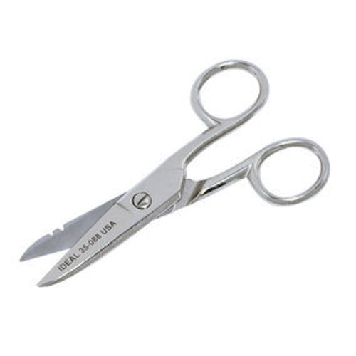 IDEAL® Electrician's Scissor, 1 in Length of Cut, Carbon Steel Blade, Blunt Tip, 5-1/4 in Overall Length, 3 in Overall Width, Ring Handle, Serrated Edge, Right Hand, Polished Chrome/Nickel Plated