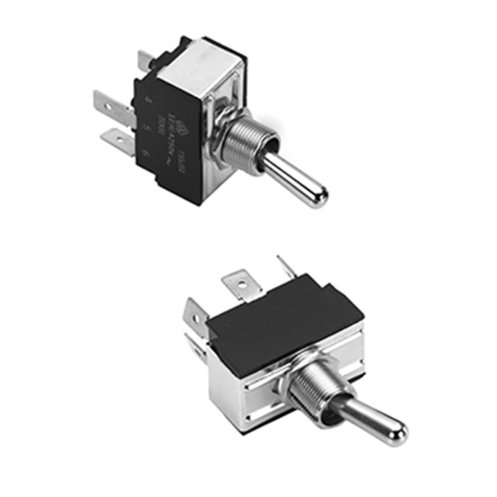 0121 series multi-pole toggle Switch full-size, single pole toggle switches. 0121 series ruggedly constructed with metallic toggle and threaded bushing to ensure extended service life. Ideal for use in marine, food service, generator, industrial control and office automation markets. Suitable for use in low voltage VDC applications.