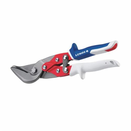 LENOX® TOOLS Aviation Snip, Cutting Capacity: 18 ga Sheet Metal/22 ga Stainless Steel, 1-1/4 in Length of Cut, Left Snip, 9-1/2 in Overall Length, Bi-Material/Non-Serrated Blade, 2 in L Blade, Plastic Handle, Comfort Grip